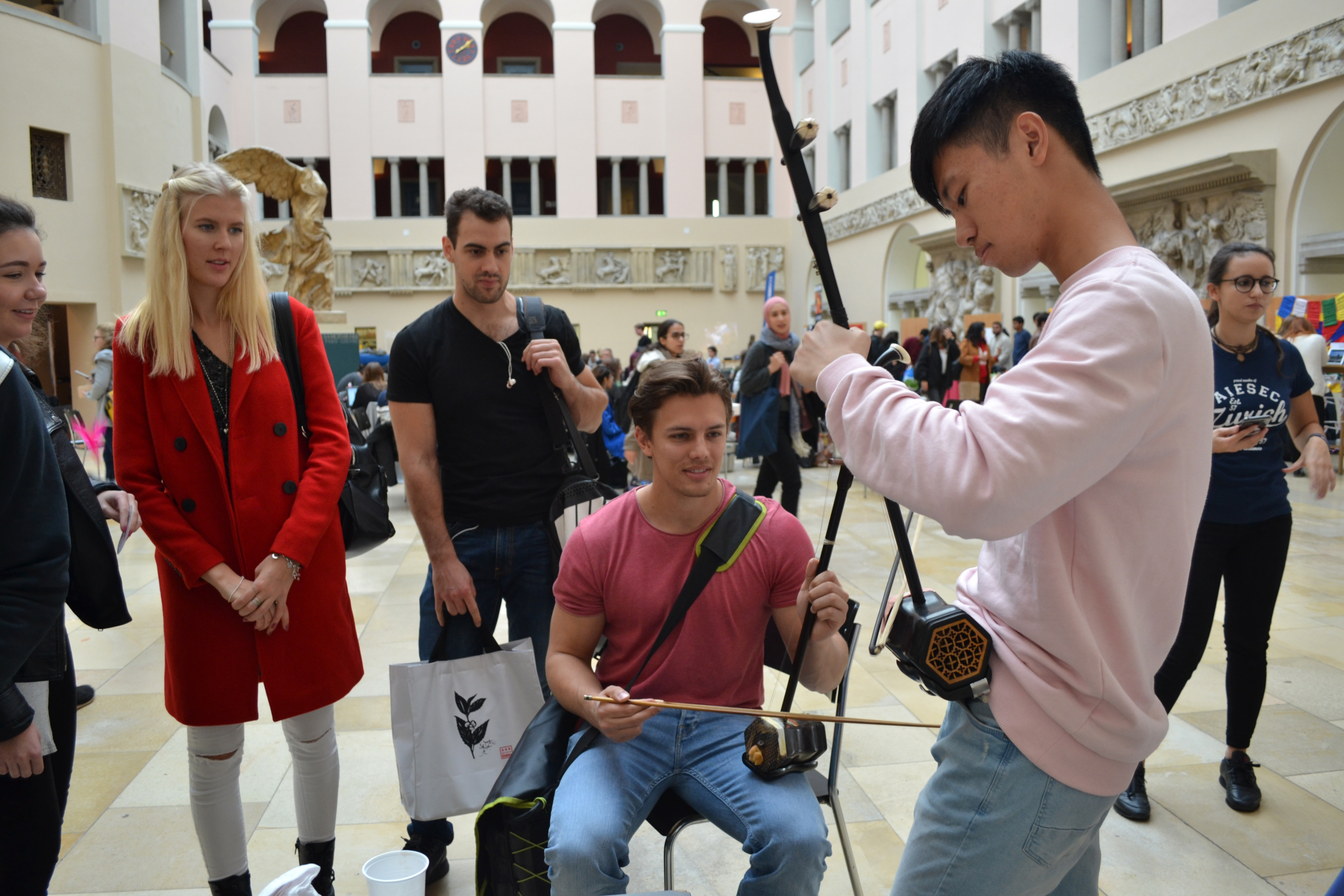 🌏✨ 今天,我们与 AIESEC 苏黎世一起参加了在苏黎世大学 Lichthof 举办的“全球村——拥抱多元文化”活动!我们的团队热情分享中国文化——嘉宾们试穿了汉服、练习了书法,还制作了珍珠奶茶 🍵✍️💫